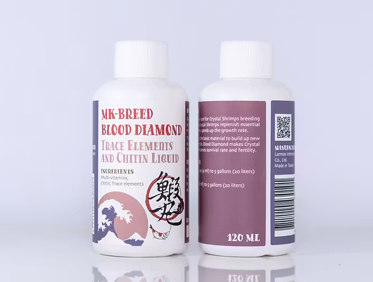 INGREDIENS Multivitaminer, kitin, spårämnen. En mängd olika vitaminer, kitin (kitin), spårämnen etc. Uppfödning är alltid det ämne som hållare av kristallräkor av högsta kvalitet gillar att prata om. I ett försök att föröka sig till kommande generationer måste Crystal Shrimps utveckla en frisk fysik och få i sig tillräckligt med spårämnen för att bli könsmogna. Ständig tillväxt är dock ingen lätt sak. Därför är det viktigt att fylla på spårämnen dagligen. Kristallräkor kan bli könsmogna 4-6 månader efter kläckningen, men huruvida den vuxna räkan har förmågan att föröka sig beror i hög grad på absorptionen av spårämnen. Vissa element kan inte produceras av kristallräkans kropp själv. Om de har lidit av allvarlig undernäring av spårämnen under en period kan det gradvis minska vissa fysiologiska funktioner. Blood Diamond innehåller en stor mängd kitin, en viktig ingrediens för att Crystal Shrimp ska kunna bygga upp skalet, och kan hjälpa räkor att nå hälsa och mognad. Det är nyckeln till att Crystal Shrimps lyckas med sin uppfödning