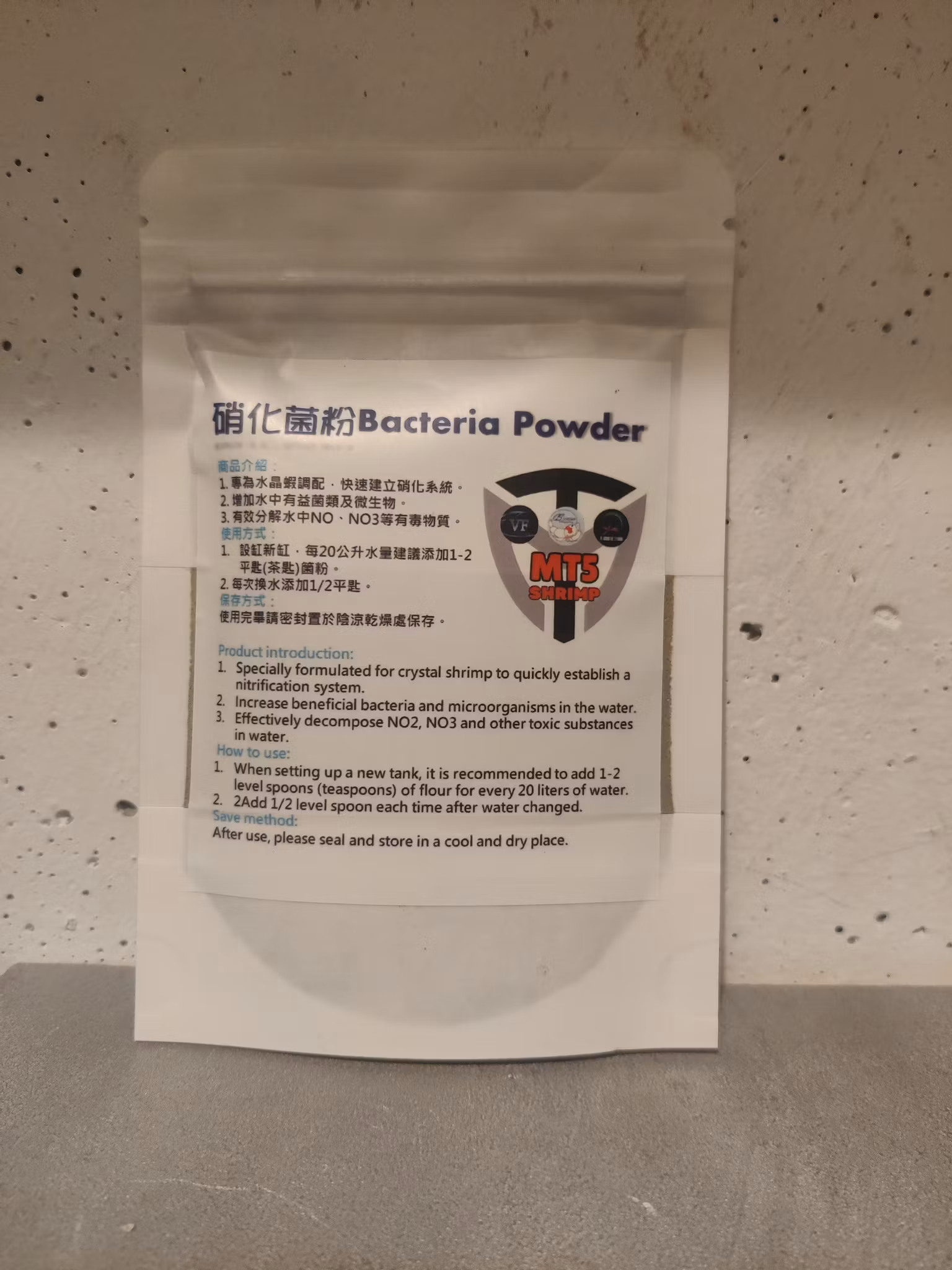 Produktintroduktion: Speciellt framtaget för kristallräkor för att snabbt etablera ett nitrifikationssystem. Ökar mängden nyttiga bakterier och mikroorganismer i vattnet. Bryter effektivt ner NO2, NO3 och andra giftiga ämnen i vattnet. Bruksanvisning: När du installerar ett nytt akvarium rekommenderas det att tillsätta 1–2 jämna skedar (teskedar) mjöl per 20 liter vatten. Tillsätt 1/2 jämn sked varje gång du byter vatten. Förvaringsmetod: Förslut och förvara svalt och torrt efter användning.
